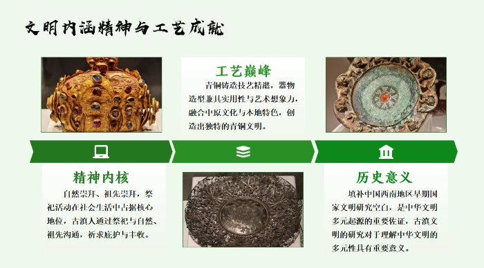 二、古滇文明:穿越千年的历史回响 古滇文明的历史回响是实践团探访的重要篇章。在晋宁石寨山遗址,滇王金印、青铜贮贝器、青铜剑等珍贵文物,实证了战国至汉代滇国文明的高度成就,其精湛的青铜铸造工艺融合中原文化与本地特色,成为中华文明多元起源的重要佐证。江川李家山遗址出土的牛虎铜案、青铜扣饰、玉璧等文物,补充了古滇国贵族生活与丧葬文化的重要信息,进一步明晰了古滇文明的辐射范围。