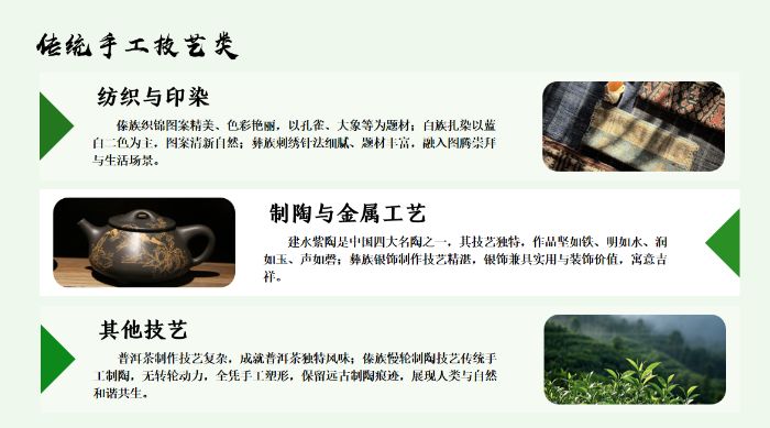 在非遗传承工坊,团员们目睹傣族织锦的精美纹样、白族扎染的蓝白意境、建水紫陶的匠心淬炼,聆听非遗传承人讲述技艺传承的坚守与创新,真切感受到传统手工技艺“活态传承”的生命力。彝族银饰的巧夺天工、普洱茶制作的繁复工序、傣族慢轮制陶的远古印记,每一项技艺都承载着民族的历史记忆与生活智慧。