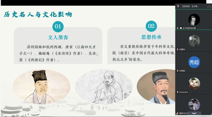 谈及“历史名人与文化影响”时,以唐寅、施耐庵等文人墨客为例,串联起江苏崇文重教的传统与科举文化的深厚积淀。