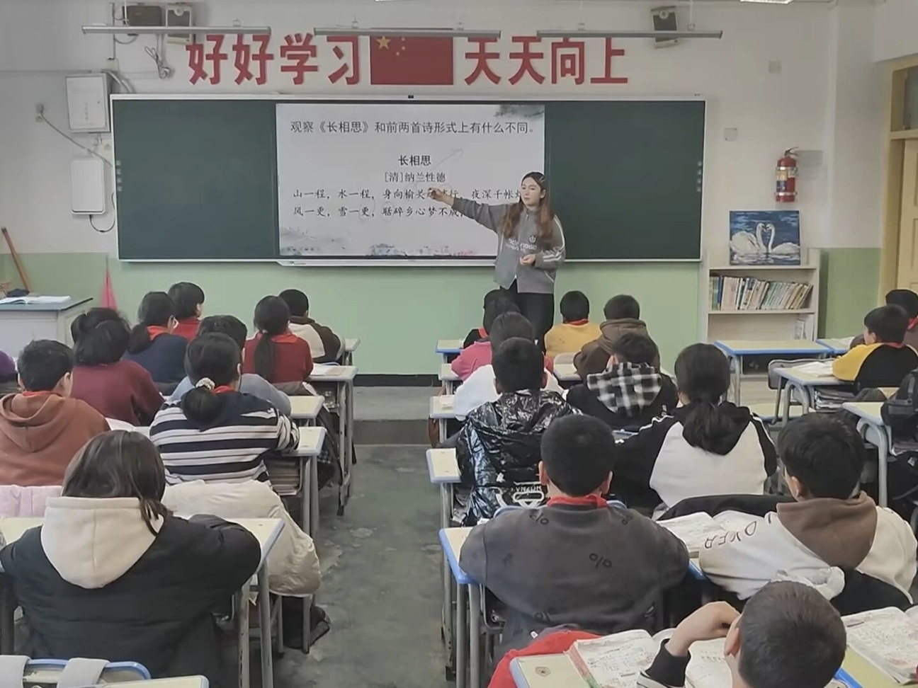 在泽普县依玛乡中心小学,团队成员阿曼尼萨·阿尤普为学生们带来别开生面的语言文化课。她将《长相思》《示儿》等古典诗词与普通话正音训练相结合,引导学生在理解诗词意境、体会情感的基础上进行发音与表达练习。学生们从最初小声跟读、发音生涩,逐渐能够有节奏、带感情地朗读全篇。学生纷纷表示,理解词意后再跟读,不仅让诗词“有了画面”,也让他们更愿意主动模仿老师标准的发音。这一教学模式既提升学生的普通话语音准确性,也在品味经典中增强他们对中华优秀传统文化的感知与认同,实现语言学习与文化浸润的双重目标。