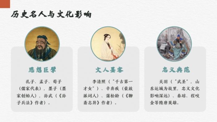 历史印记板块则串联起齐鲁文明的千年佐证。从齐国故城的霸业遗迹、龙山文化遗址的“蛋壳陶”技艺,到曲阜三孔的思想传承,这些世界文化遗产与古遗址,见证了山东的文明演进;蓬莱阁的海上丝绸之路印记、台儿庄古城的运河与抗战文化、趵突泉的泉城底蕴,成为山东标志性的历史文化地标;而孔孟荀、孙武、李清照、辛弃疾、蒲松龄等一众历史名人,从思想巨擘到文人墨客,让观众感受到齐鲁大地人才辈出的文化底蕴。