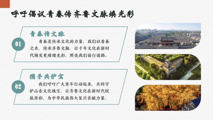 宣讲尾声,实践团发出“共守齐鲁文脉续写时代新篇”的倡议,呼吁广大青年以青春之名,传承齐鲁文化精髓,在守护文化根脉的同时注重创新发展,让千年儒风在新时代焕发新光彩。此次线上宣讲打破了地域限制,以青年视角解码齐鲁文化,不仅让观众系统了解了齐鲁文化的丰富内涵与时代价值,更激发了大家对中华优秀传统文化的保护意识与传承热情,是青年一代投身文化传承的生动实践。