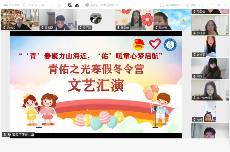 2026年2月9日19:00,湖北工业大学青佑之光志愿服务团“爱心云托班”线上文艺汇演精彩启幕。本次汇演以“‘青’春聚力山海近,‘佑’暖童心梦启航”为主题,邀请“爱心云托班”全体学员和志愿者老师齐聚云端,用歌声、朗诵、舞蹈等多样形式,献上了一场充满童真、情感真挚的文艺盛宴,为云端陪伴的时光写下温暖注脚。
