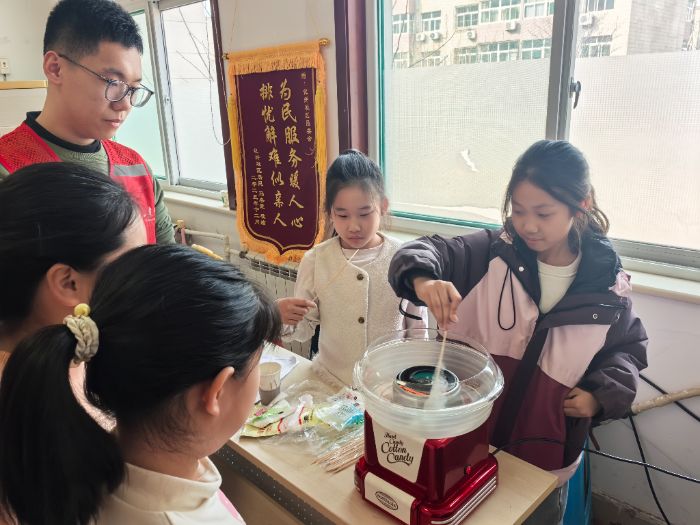 2026年2月10日,山东省济南市历城区化纤小区社区活动中心内,山东大学青年志愿者联合会“杏暖化纤,医护童心”社会实践队继续开展第二日志愿服务活动。当天上午,志愿者带领孩子们走进趣味数独的世界,锻炼逻辑思维;下午则共同体验棉花糖制作与毛笔书法,在动手动脑中感受传统节日的甜蜜与墨香。