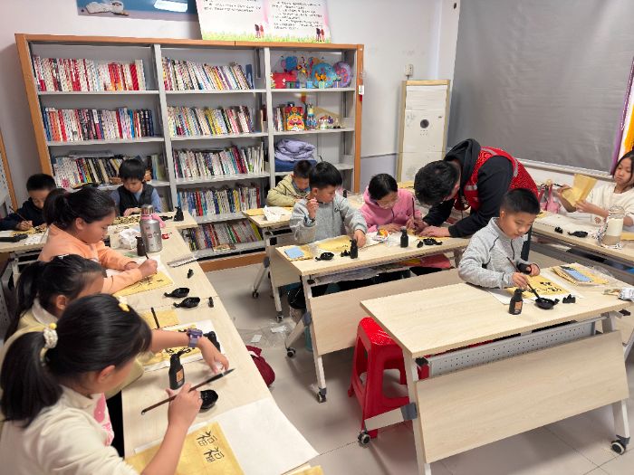 甜蜜的体验刚过,墨香又起。在随后的福字书法课上,志愿者为孩子们讲述“福”字的文化寓意与贴福传统,从握笔姿势到笔画走势,一步步带领他们书写新春的祝福。孩子们发挥创意,为福字添上童趣装饰,一幅幅充满个人特色的“福”字在宣纸上绽放。