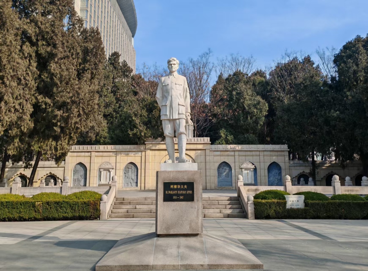 图为实践团成员在华北军区烈士陵园瞻仰柯棣华大夫墓。贾高阳 供图