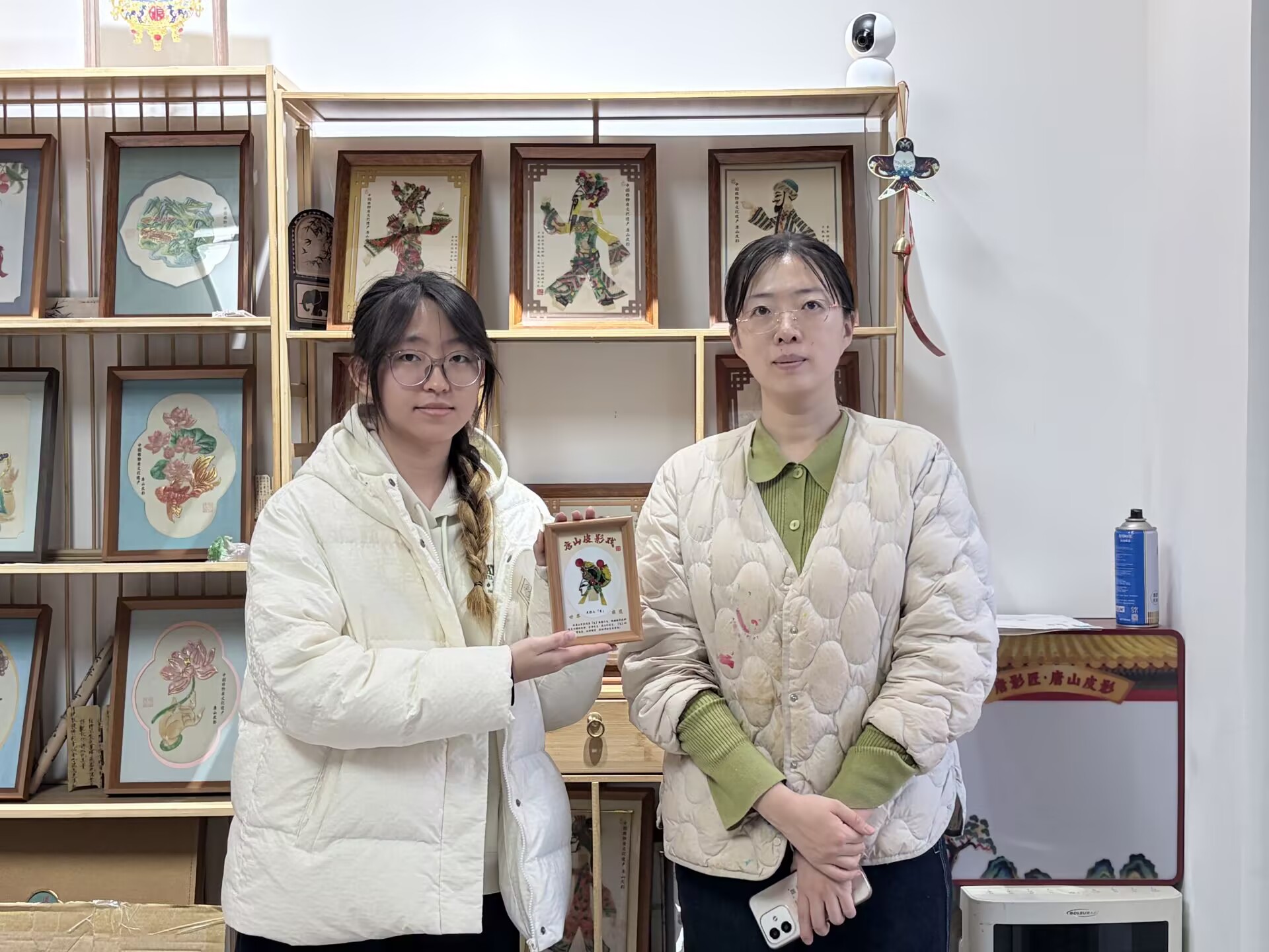 图片为成员在唐山皮影非遗工作室,手持亲手制作的皮影作品,与指导老师合影,在光影流转间感受非遗匠心