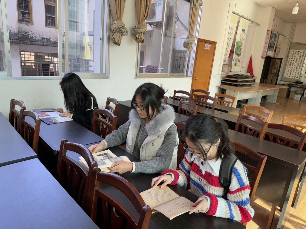 翻阅典籍文献,追溯彩调源流 实践团首站走访永福县图书馆,从馆藏文献中追溯彩调文化的历史根源。在图书馆工作人员的专业指引下,团队成员潜心翻阅彩调剧本手稿、专题研究专著、地方文化志等资料,认真记载彩调的发展历程、经典剧目等内容,系统梳理出彩调从明末清初起源、清代逐步成熟,到2006年入选第一批国家级非物质文化遗产名录的完整脉络。在《王三打鸟》等经典剧本的研读中,成员们真切体会到彩调的艺术特色与文化底蕴,为后续实地调研筑牢理论基础。