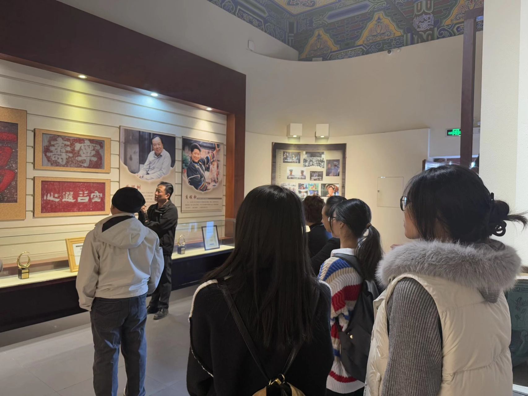探访馆藏实物,触摸彩调温度 实践团第二站走进永福博物馆,在实物展品中探寻彩调文化的传承脉络。博物馆内的彩调专属展区,陈列着泛黄的老艺人演出剧照、绣工精致的彩调戏服头冠、古朴的二胡与铜鼓等伴奏道具,还有不同时期的剧本刻本、现代彩调队获奖证书。团队成员跟随讲解员认真参观,驻足细观、详细记录,还与博物馆工作人员深入交流,探讨彩调文化的保护现状与传承困境。成员们结合专业知识,深入体会彩调的历史与艺术价值,为探索彩调非遗活化路径奠定坚实基础。