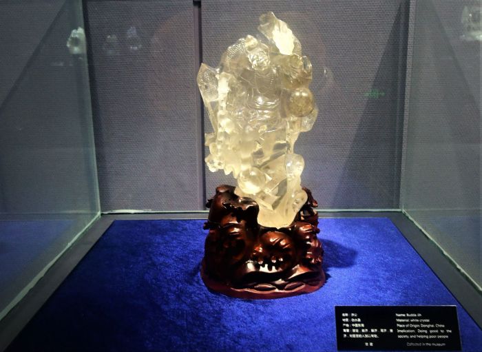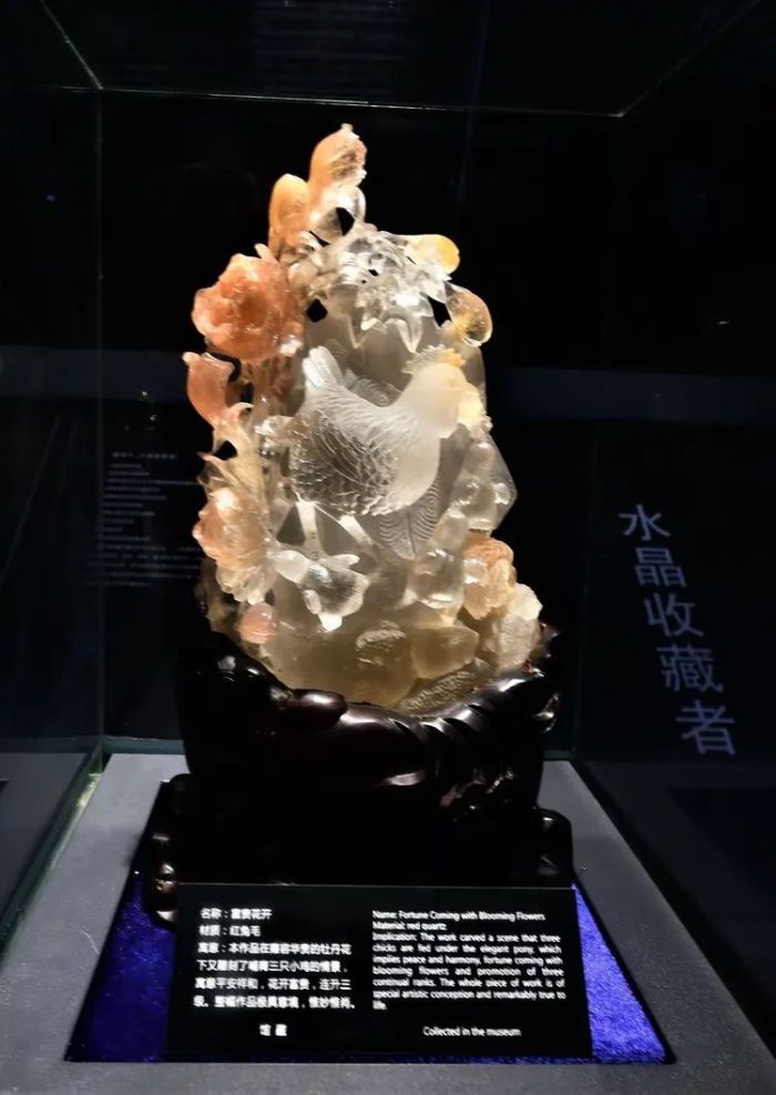 图为实践团团员参观连云港东海县东海水晶博物馆的富贵花开和白水晶济公像。张耘博供图
