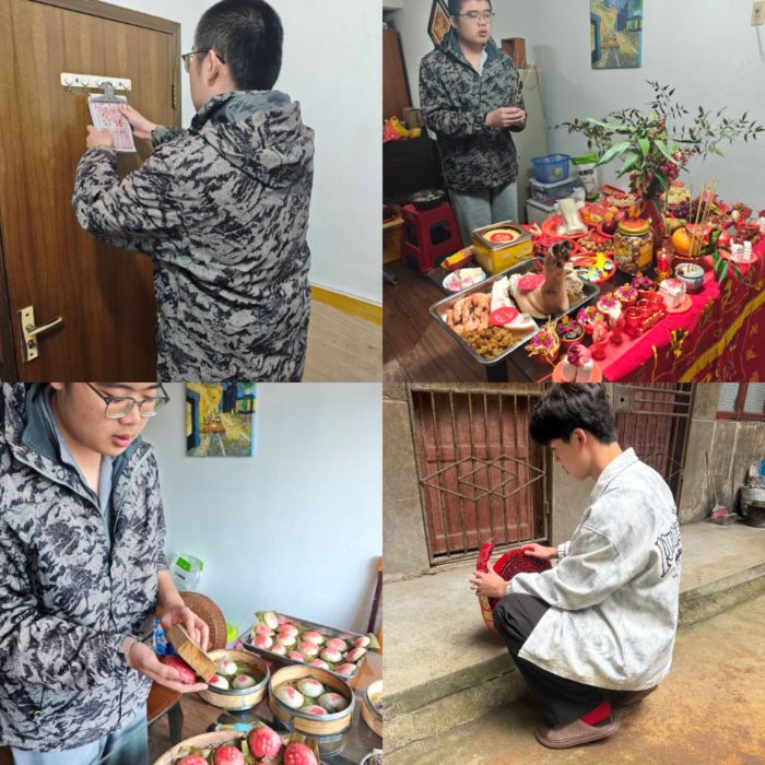 自主实践,亲身体验 活动期间,队员们根据自身实际情况,制定个性化的实践方案,开展各自的线下实践。为了更好地体会春节的年俗魅力,实践队成员们亲身参与到家庭的春节的节日活动当中,体验春节的传统习俗,通过对换年历、祭祖、观看游神活动等习俗活动的亲身体验,学习到如换年历有驱邪避害、纳福迎祥的象征也预示着新的一年是新的开始;春节祭祖是对孝道的传承也是人们祈求先祖庇佑的形式,寄托着人们对未来美好的期望,更能够增强家庭的凝聚力;游神活动是非遗的传承,是祈求来年风调雨顺的形式,寄托人们的期盼。在体验过程中,感受春节期间充满年味的“仪式感”和家中喜气洋洋的节日氛围,感悟春节的文化魅力。