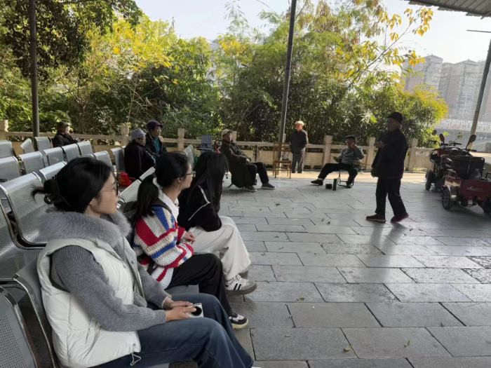 为近距离感受彩调的活态传承,实践团走进永福县街头广场,现场观摩当地老年彩调队的精彩表演。老艺人们以桂柳方言演绎经典唱段,二胡与铜鼓的旋律婉转悠扬,一招一式间尽显彩调“载歌载舞、诙谐生动”的艺术特色,精彩的表演赢得现场观众连连喝彩。演出间隙,队员们与老艺人促膝交谈,聆听他们数十年坚守彩调传承的故事,真切体会到彩调早已融入永福百姓的日常生活,成为当地不可或缺的精神文化符号。