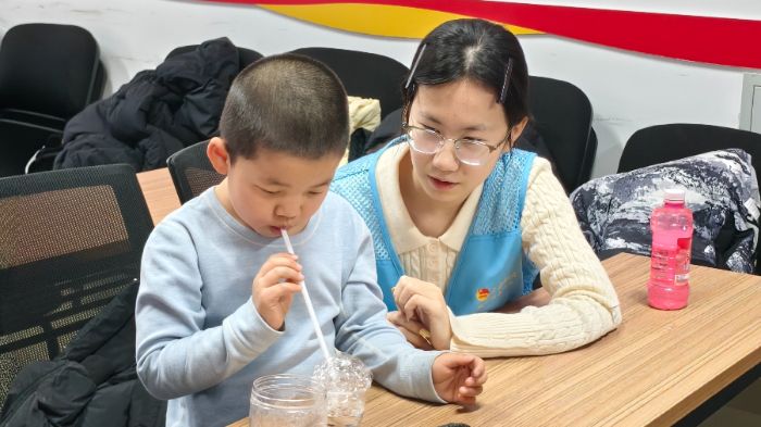 动手实践:亲手创造“漂浮的泡泡” 讲解结束后,实验环节正式开始。志愿者为小朋友们分发了透明塑料杯、食用小苏打、食用白醋和泡泡棒,并细致演示了实验步骤:先在杯底铺上一层小苏打,再缓慢倒入白醋,观察气泡从杯底“咕嘟咕嘟”向上翻涌的过程。当看到大量泡沫像小火山一样“喷发”时,孩子们兴奋地拍起手来,有的还小心翼翼地伸手感受气泡带来的微凉触感。待气泡平息后,小朋友们拿着泡泡棒向杯中吹入彩色泡泡,原本轻飘飘的泡泡没有立刻飘走,反而像被施了魔法一样在杯内悬浮、缓缓浮动。志愿者趁机引导大家观察思考:“为什么泡泡会浮在杯子里呢?”在你一言我一语的讨论中,孩子们逐渐明白,小苏打与白醋反应产生的二氧化碳密度比空气大,而我们呼出的气体密度相对较小,正是这种密度差让泡泡“稳稳地”待在了杯子里。现场的欢笑声、惊叹声和讨论声交织在一起,让整个社区活动室充满了探索的乐趣。