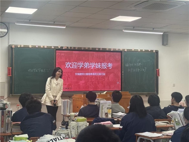 互动答疑:搭建沟通的桥梁。宣讲结束后,两位学姐与学弟学妹展开热烈交流,从高考备考技巧到志愿填报策略,从专业选择到大学生活适应,一一耐心解答。她们还建立了线上咨询群,邀请对师大感兴趣的学子持续交流,并鼓励大家关注“福建师范大学本科招生”公众号,获取最新招生资讯。