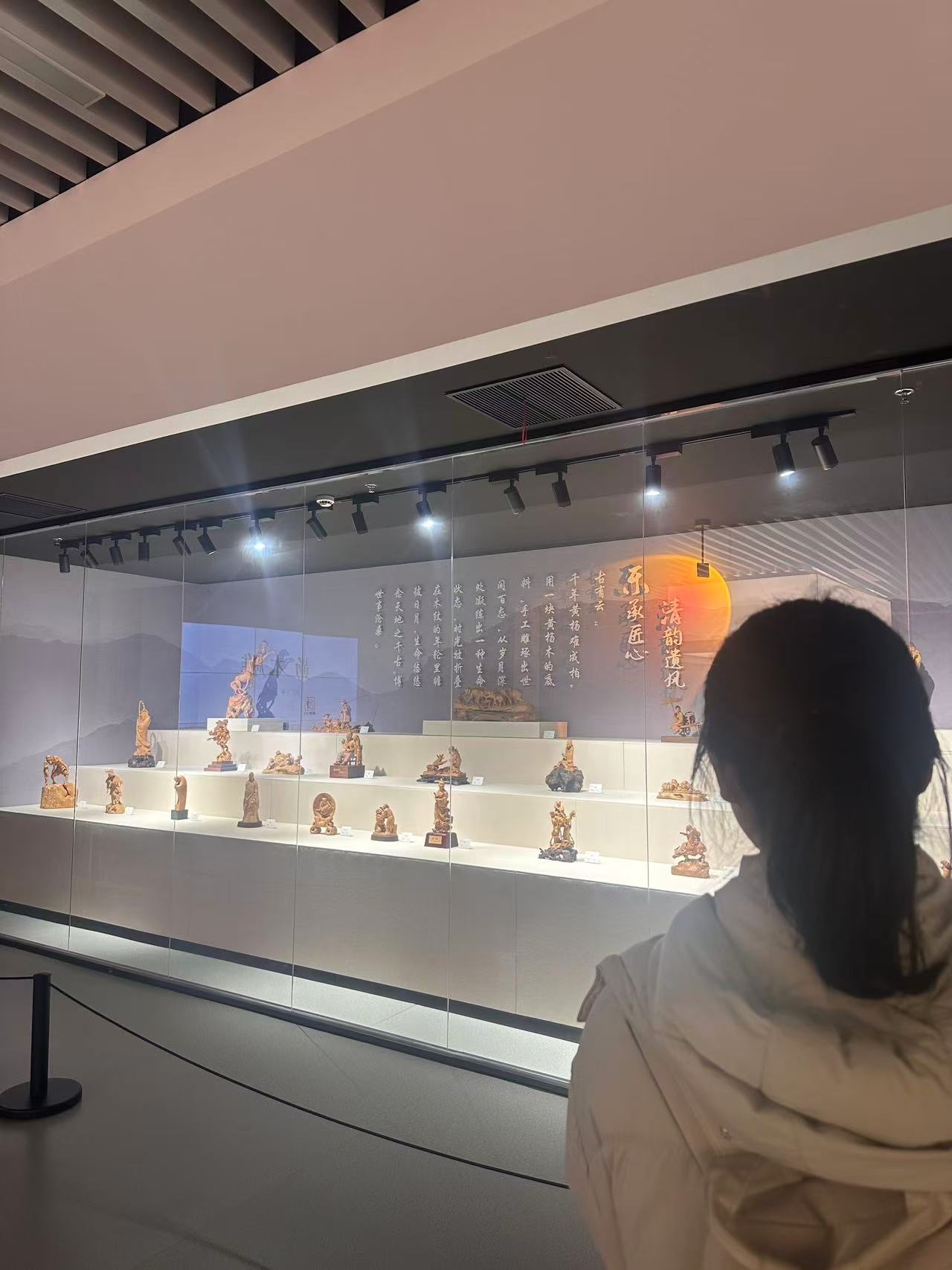走进乐清非物质文化博物馆,浓郁的非遗文化气息扑面而来,馆内藏品丰富、布展精致,系统展现了乐清本土非物质文化遗产的历史底蕴与艺术魅力。在博物馆工作人员的带领下,实践团依次走进黄杨木雕专题展区进行参观学习。展区内,一件件造型典雅、雕工细腻的黄杨木雕作品整齐陈列,从传统人物圆雕、民俗场景摆件到现代创新文创产品,从大型精品力作到小巧精致的生活小件,完整呈现了乐清黄杨木雕从传统民间工艺走向当代大众生活的发展脉络。