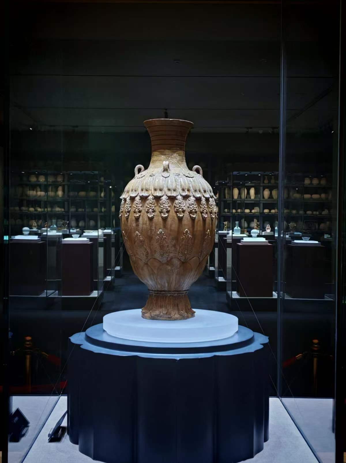 步入博物馆核心历史展区,一件气势恢宏的北朝青釉莲花尊傲然矗立,成为全场瞩目的焦点。这件高59.5厘米的青瓷重器,1982年出土于淄博淄川龙泉镇,是目前国内唯一可明确窑口的北朝莲花尊,堪称博物馆的“镇馆之宝”。其釉色青中泛黄,温润莹亮,历经千年岁月依旧光泽如初;器身通体装饰多层莲瓣、宝相花与忍冬纹,融合模印、堆塑、刻花等多种精湛工艺,层层叠叠的纹饰繁复而不杂乱,细腻而不失大气,完美展现了北朝时期佛教文化与北方陶瓷技艺的深度交融。