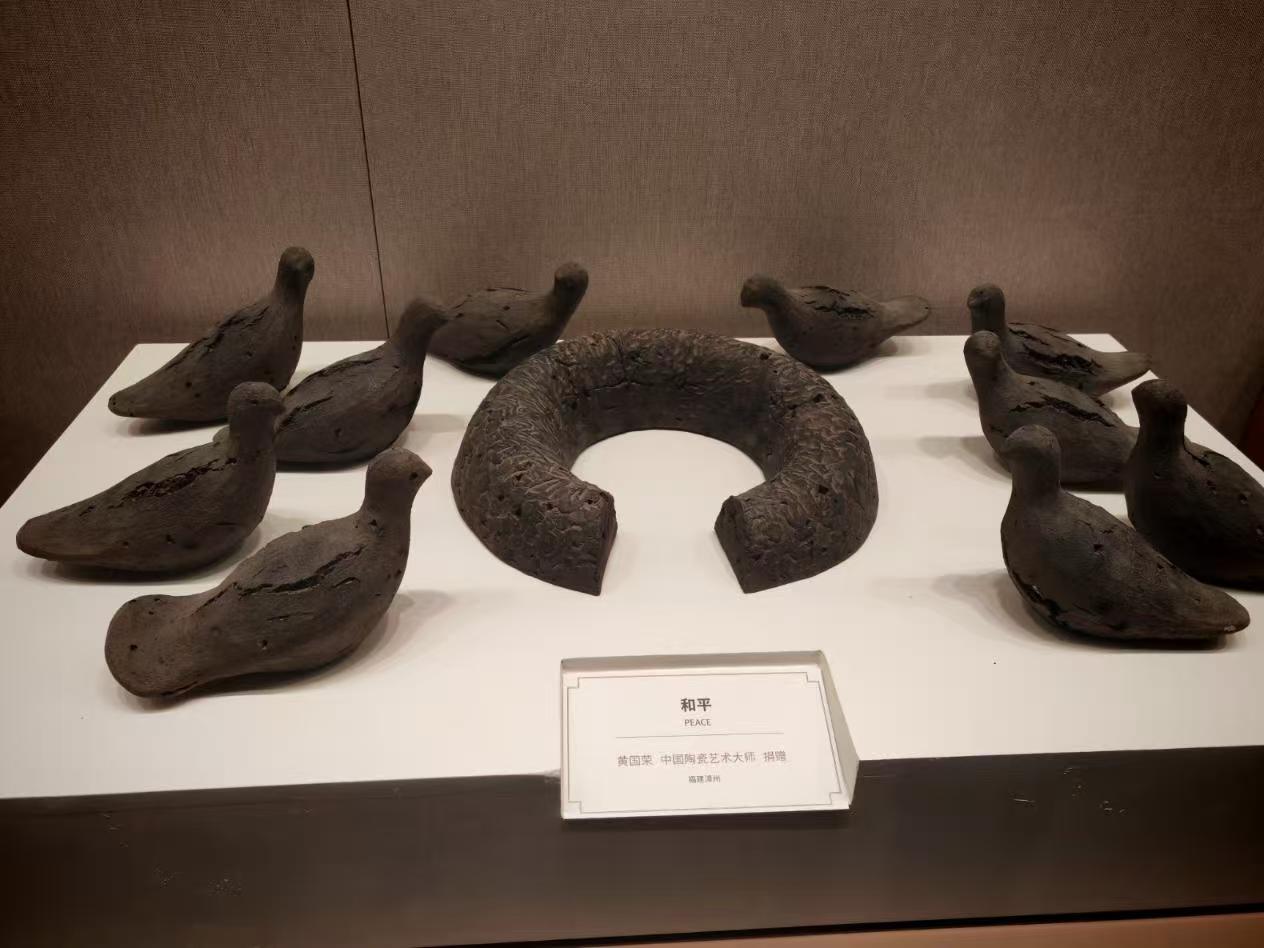 不远处,中国陶瓷艺术大师黄国荣捐赠的陶艺作品《和平》,以极简的造型传递出深刻的时代内涵。一圈粗犷质朴的黑陶圆环,环绕着十只形态朴拙、线条流畅的飞鸟,黑陶独有的深沉质感与灵动线条相互映衬,将“和平共生、万物和谐”的理念凝练得简洁而直击人心。队员们细细品读作品的造型与寓意,纷纷表示,这些当代陶塑作品早已超越了单纯的艺术审美,更是当代匠人对传统文化、社会现实与时代精神的深度思考,是传统工艺在当代焕发新生的生动体现。