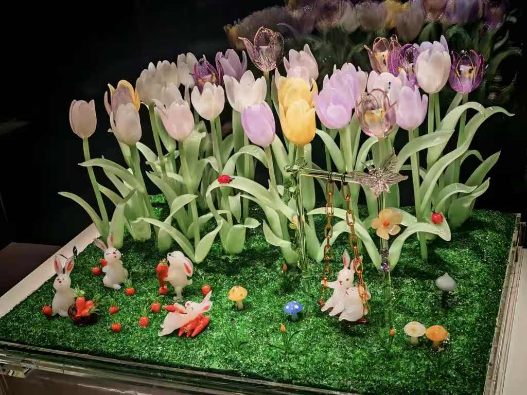展区内,《郁金香与兔子》琉璃场景则以治愈温馨的风格,俘获了队员们的目光。粉、紫、黄、白各色琉璃郁金香亭亭玉立、娇艳欲滴,几只造型可爱的琉璃兔子或蹲或卧,有的悠闲荡秋千,有的低头啃食浆果,翠绿的琉璃“草地”上点缀着小巧的蘑菇与翩跹的蝴蝶,将春日的生机与美好永远定格在晶莹的琉璃之中。“原来琉璃不只是传统的工艺品,还能如此灵动治愈,把自然之美与生活之趣完美融合。”队员们一边用手机记录着这份美好,一边由衷赞叹。此外,蓝紫渐变的鸢尾花琉璃、宛若江南春景的玉兰花琉璃装置、带着冰裂纹理的粉白琉璃瓶……每一件作品都独具匠心,色彩交融、光影交错,淋漓尽致地展现着琉璃工艺“火中凝晶、色韵天成”的极致浪漫,让队员们深刻感受到传统琉璃工艺的细腻、灵动与无限创造力。