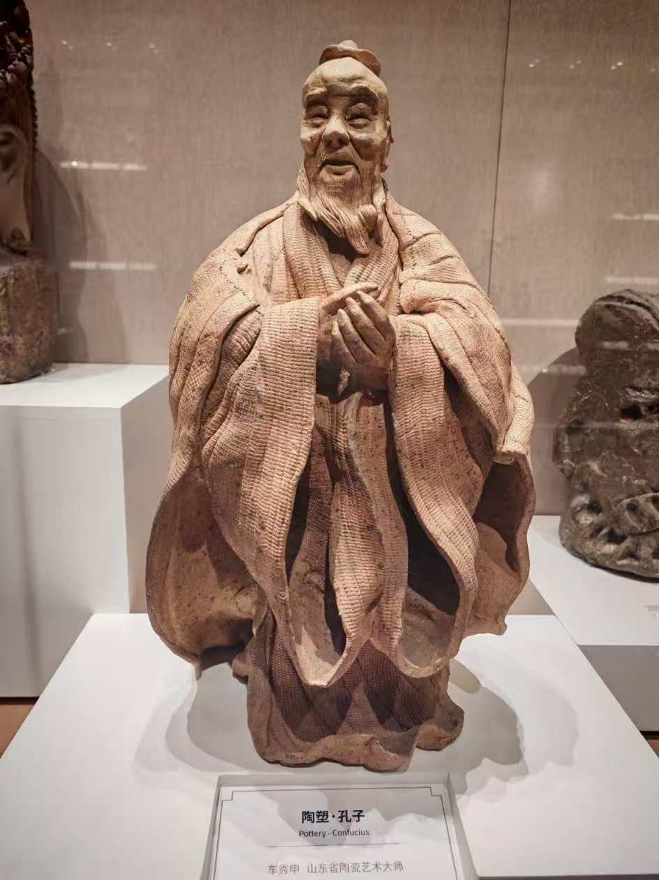 穿越历史的长河,来到现代陶艺展区,传统工艺与现代创意碰撞出璀璨火花,一件件富有生命力的当代陶塑作品,让队员们感受到泥土中蕴含的人文温度与时代精神。车秀申大师创作的陶塑《孔子》像,成为队员们驻足品读的核心作品。作品摒弃繁复华丽的装饰,最大限度保留陶土的原始质感与自然肌理,衣纹褶皱雕刻自然流畅、简约传神,孔子双手合十,面容温和肃穆、神态安然,仿佛正端坐于杏坛之上,轻声诉说着“仁礼”之道与儒家思想的精髓。