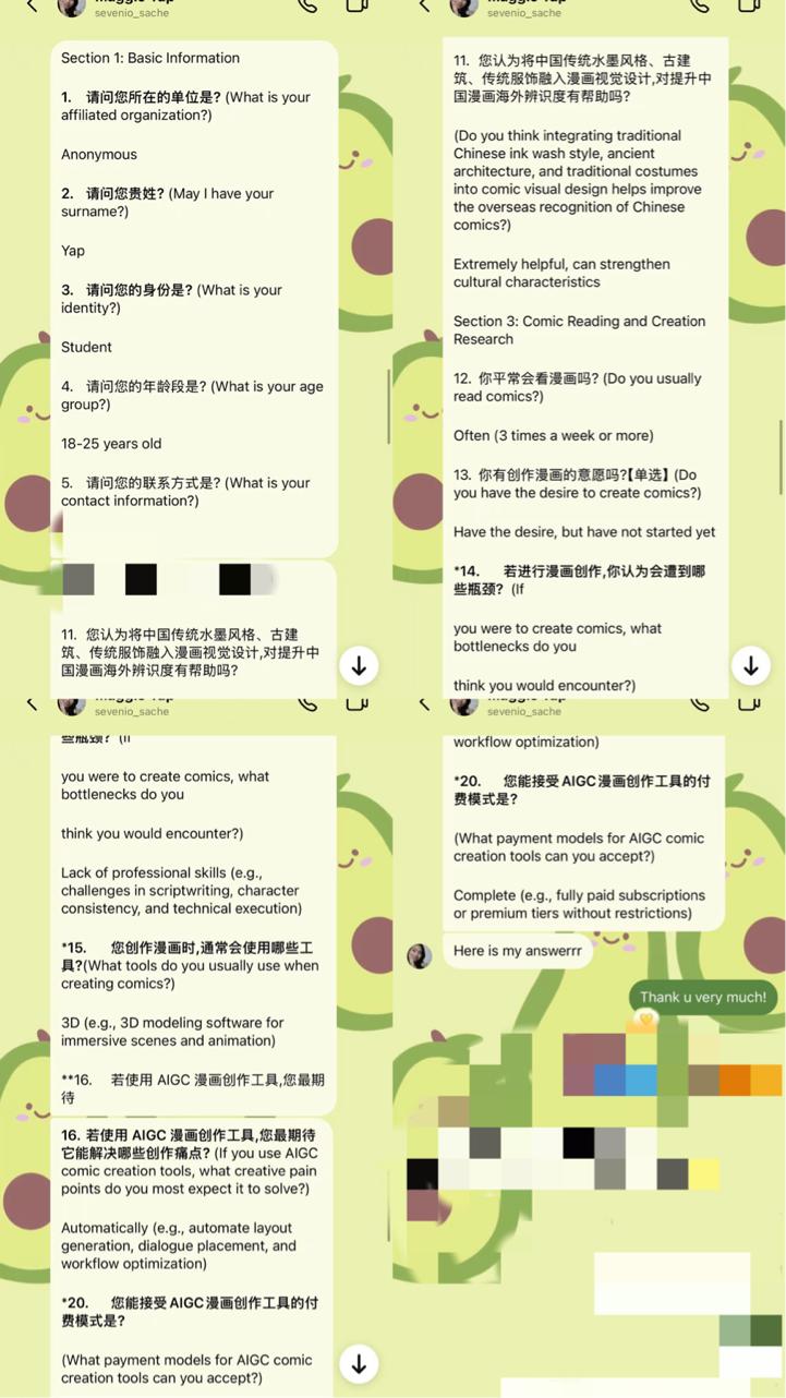 为精准把握海外受众对中国漫画的认知与期待,验证 “AIGC 沉浸式空间漫画创作工具” 的国际化适配性,山东大学(威海)“灵境漫游”研队队成员姜宇馨于2026年2月24日对一位匿名海外受访者开展了线上访谈。受访者为在校外籍留学生,其反馈为项目出海方向提供了重要参考。