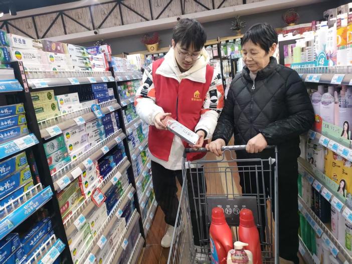图为组员在超市志愿服务并询问老人对文化变化的感触。程心磊 供图