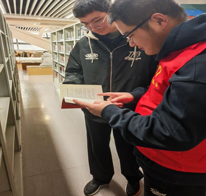 图为组远在图书馆志愿学习并负责文化专区图书整理。郭岩 供图