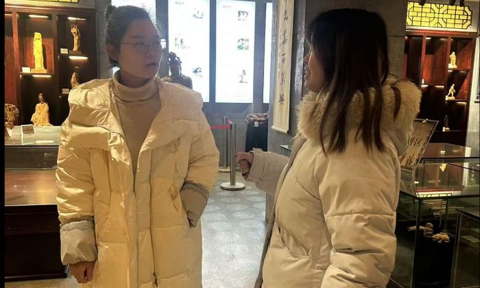 图为博物馆工作人员与实践团成员交流关于黄杨木雕的历史。王韵供图。
