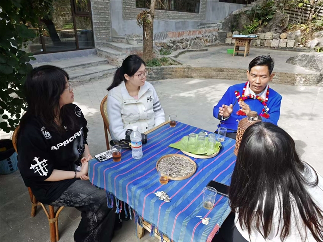 在三台山德昂族乡出冬瓜村,队员们走访酸茶传统作坊与百年古茶园,亲眼见证竹筒埋土发酵、手工蒸青等传统工艺的活态留存,详细记录从鲜叶采摘到压制干燥的全流程技艺细节。通过与国家级酸茶制作技艺传承人赵腊退村中长者面对面交流,深入了解史诗在婚礼、祭祀等民俗场景中的传唱传统及其当代演变。