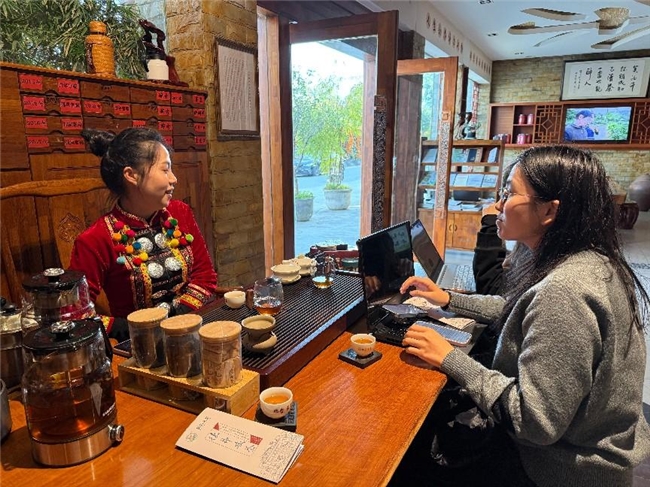 走进德凤茶厂这一酸茶产业标杆企业,实践队实地考察品牌展示区,与销售人员深入座谈,详细了解滚筒杀青、陶罐标准化发酵等创新工艺应用情况,对比传统手作与现代量产的优劣差异,全面掌握SC认证、地理标志保护、品牌文化建设等关键举措,以及沪滇帮扶协作带来的产能提升与市场拓展成效。