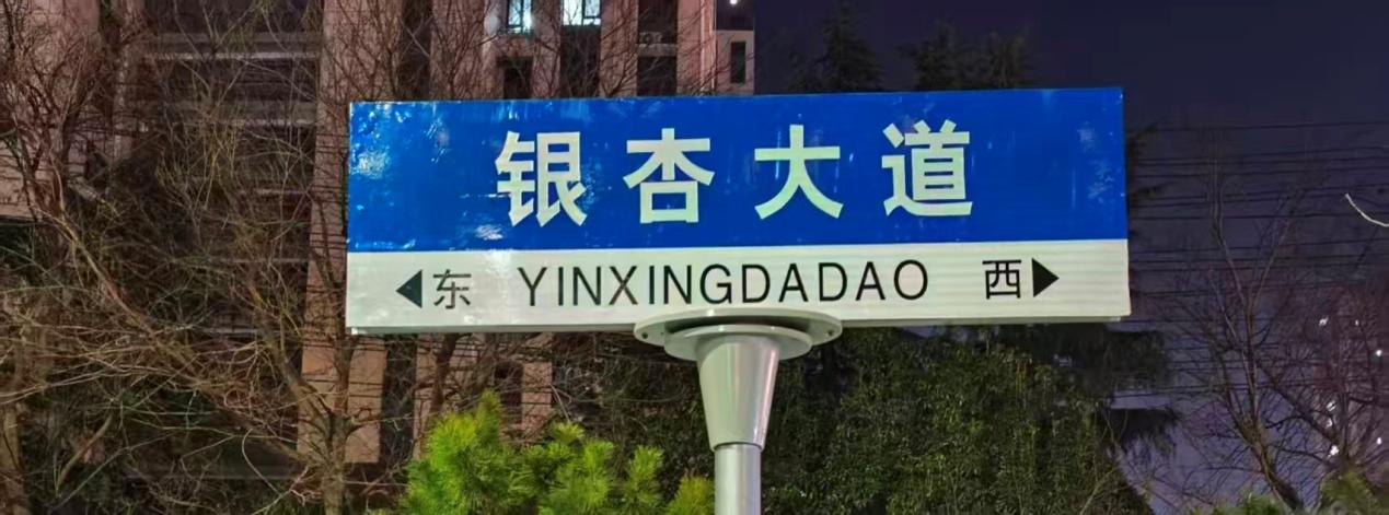 刚抵达徐州,团队便以步行与骑行结合的方式,穿梭在老城区的街巷与新城区的干道之间。队员们随身携带的笔记本上,很快就记满了对银杏大道、长江路、轻工南路等十余块路牌的观察细节。银杏大道,这是一块蓝底白字的标准市政路牌,下方白色区域标注了拼音和东西方向箭头,信息直观、辨识度高,兼具功能性与实用性。在徐州,“银杏大道”不止是一个路名,更是一张城市文化名片。徐州的道路命名常常与自然、历史元素结合,“银杏大道”的命名延续了这一传统。它既保留了徐州“山水城林”的城市肌理,又以鲜活的自然景观串联起历史与当下,让市民在日常通勤中也能触摸到城市的人文温度。徐州既有厚重的历史底蕴,又有灵动的自然意趣。“银杏大道”这类路牌,正是这种气质的缩影:它既是指引方向的实用标识,也是徐州人“与自然共生”生活态度的一种表达,让城市的人文与自然景观在方寸之间得到统一。