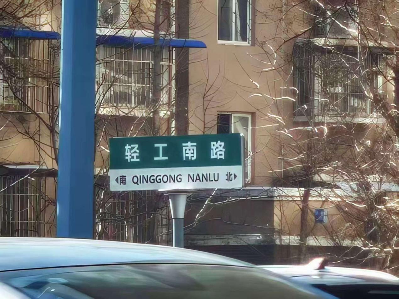 在走访轻工南路时,-它采用了绿底白字的配色,这是全国通用的南北走向道路标识色,和徐州当地的路牌规则完全吻合,一眼就能判断出轻工南路是一条南北向道路。下方的白色底栏标注了拼音“QINGGONG NANLU”和南北方向箭头,信息清晰,更是符合现代城市路牌的标准化要求。 字体选用了简洁的无衬线体,字形方正有力,和徐州作为南北交汇、兼具硬朗气质的城市形象相呼应。整体设计遵循了徐州路牌“经久耐用、美观大方、维护简便”的设计原则,没有多余的装饰,实用性优先,体现了这座工业城市的务实风格。在文化细节上,