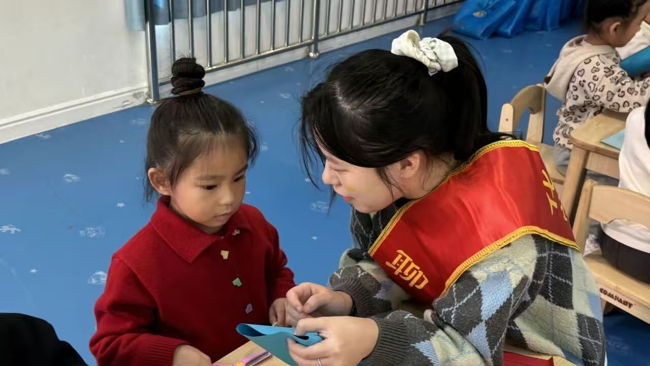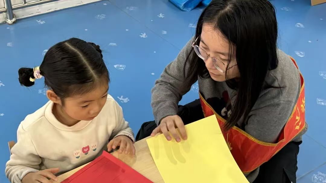 图为志愿者为儿童讲解灯笼的制作步骤。任彩懿摄