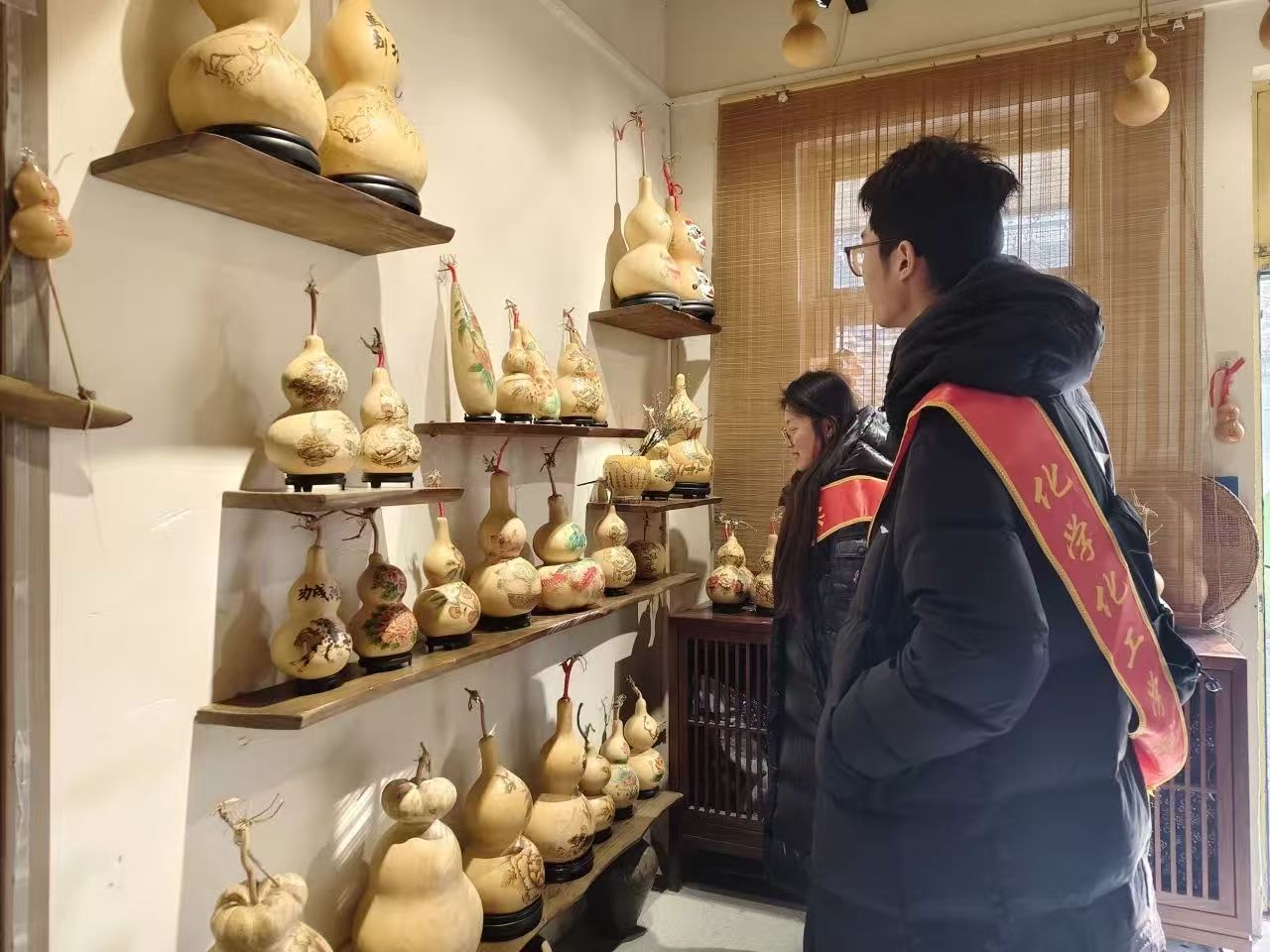 走进现场,各式各样的葫芦工艺品让志愿者们眼前一亮。这些工艺品题材十分丰富,有神话故事、花鸟图案,也有各类吉祥纹样,件件都藏着美好的寓意。大家认真观察着葫芦的造型和雕刻纹路,还记下了它们在家居装饰、礼品赠送等方面的用途,真切感受到了聊城葫芦工艺的独特价值。