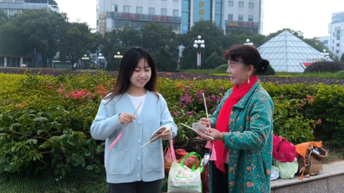 (图为实践团成员跟随桂林渔鼓“天天唱”艺术团的老师学习桂林渔鼓伴奏乐器)