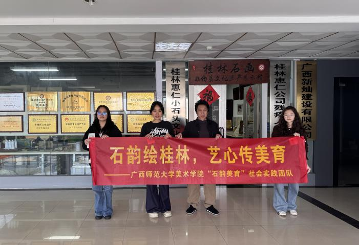 党的二十大报告明确建设社会主义文化强国的要求,在国家“以人为本”的非遗发展趋势下,课堂式非遗传承模式彰显重要美育价值。2026年 2 月 20 日,广西师范大学“石韵美育”实践队于桂林开展社会实践,以桂林石画为切入点,通过实地调研、课程设计、课堂实践的完整路径,探索其融入小学美术课堂的可行性,打造本土非遗美育课程,推动非遗文化社会化、本土化传承,为提升学生审美与传统文化素养提供借鉴,以优秀传统文化赋能乡村美育与文化振兴。