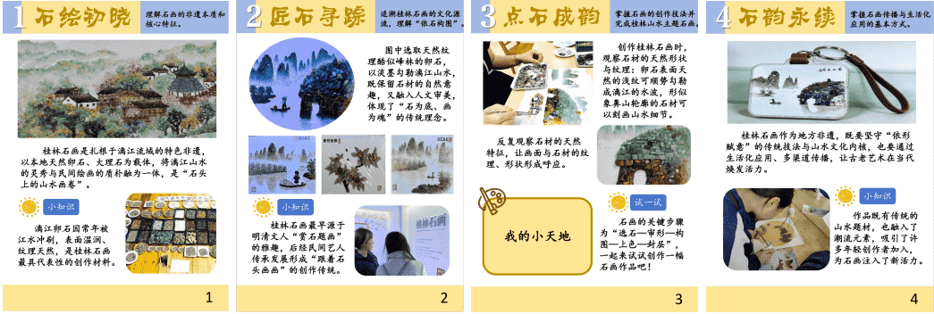 匠心研课,融合美育理念习近平总书记强调:“全面加强和改进学校美育,坚持以美育人、以文化人,提高学生审美和人文素养”。基于走访传承人所获的非遗知识与技艺要点,实践队紧扣乡村学生的认知特点与美育需求,秉持跨学科融合的教学理念,将美术课程与桂林本土历史、桂林文化、手工科学等内容深度结合,精心研发设计“非遗+美术课”系列特色课程。课程以趣味化、生活化的形式拆解桂林石画创作难点,融入非遗文化讲解与动手实践环节,既凸显桂林石画的本土特色,又兼顾美育教学的专业性与趣味性,让非遗文化能够更好地融入乡村小学美术课堂,助力学生感知非遗之美、理解文化内涵。