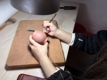 团队成员两人一组,轮流上手实践。从最初的手忙脚乱,到逐渐找到手感,大家在一次次尝试中感受泥料在指尖的变化。“看似简单的拉坯,实际操作起来太难了,想要做出规整的器型,真的需要日积月累的练习。”一名成员在反复尝试后说道。在雕刻环节,指导老师展示了坭兴陶传统的花鸟、山水纹样雕刻技法,并鼓励大家发挥专业特长,尝试将现代元素融入传统纹样。团队成员结合美术专业知识,在坯体上勾勒出简约的线条图案,将传统工艺与现代审美巧妙融合。