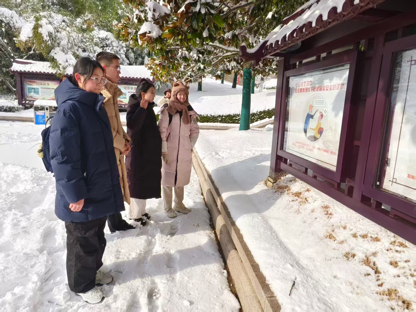 在学习国家安全知识的同时,实践队还前往烈士陵园缅怀英烈。陵园中松柏肃立、气氛庄严,队员们在烈士纪念碑前默哀致敬,表达对革命先烈的崇高敬意。大家自发清扫纪念碑上的积雪,让烈士们的名字重新清晰地呈现在阳光下。那一刻,历史与现实仿佛在此交汇。许多烈士在二十岁左右便为国家和民族献出了生命,这让队员们深刻感受到今日和平的来之不易。通过这次缅怀活动,大家更加深刻地理解到,国家安全不仅体现在科技发展与制度建设之中,也凝结着无数英雄烈士的奉献与牺牲。