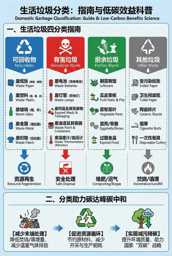 在扎实的理论基础上,团队紧扣“双碳+垃圾分类”核心主题,结合城乡居民的认知特点与生活实际,分工协作精心筹备宣传物料。成员们自主设计并制作了主题海报及便民宣传折页。该海报采用直观的色彩编码与趣味图示,不仅将生活垃圾精准划分为四大阵营,还详细列举了废旧电池、瓜皮果核、陶瓷碎片等常见物品的正确归属及其“资源再生、安全处理”等最终去向。