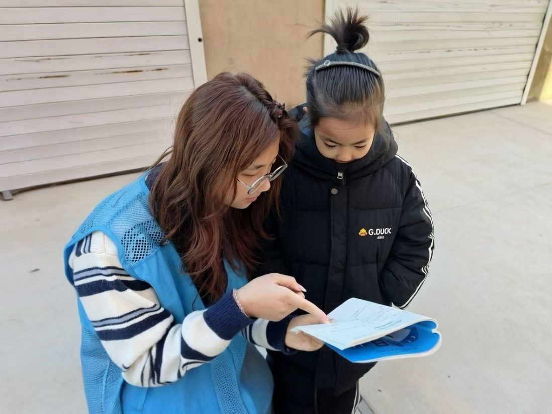 团队创新实施“调研+助学”双轨实践模式。团队成员贾荟茹走进临沂市沂南县托管机构,面向低龄学生开展访谈调研。她以“小英雄王二小”等红色经典故事为载体,通过生动鲜活的叙事引导青少年厚植爱党爱国情怀,让红色基因在青少年心中生根、发芽。团队成员于嗣琪深入松原市站前街社区,以朗朗上口的旋律为媒介,组织社区小朋友学唱红色儿歌《红星歌》,显著增强红色精神在新时代的感染力,提升育人实效。