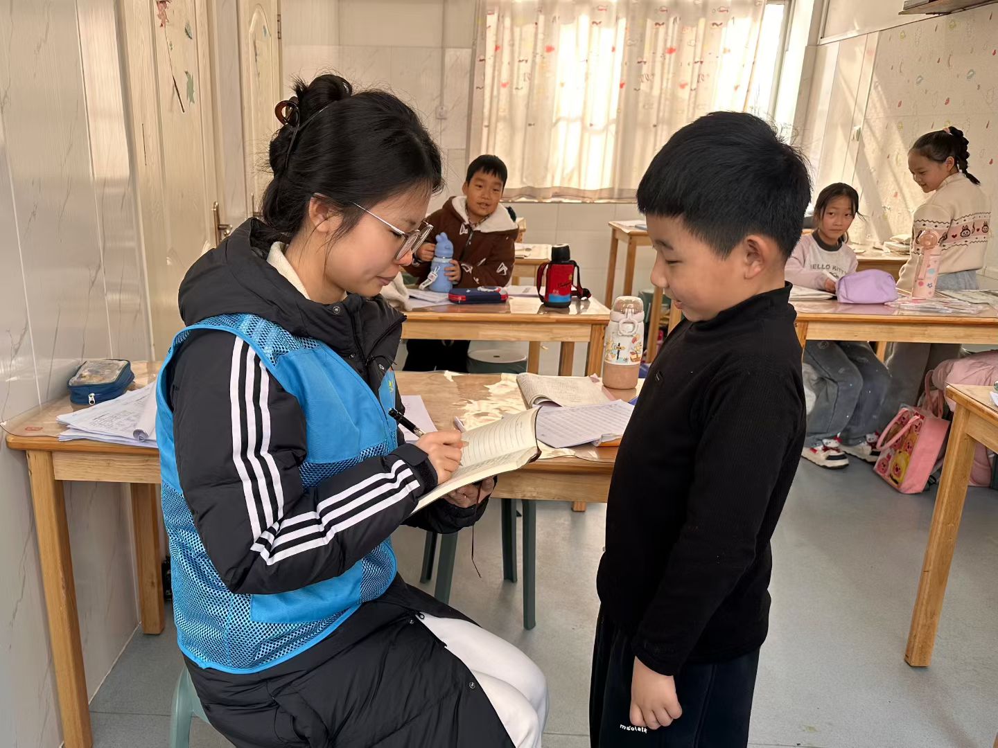 针对低龄学段学生的认知规律,团队系统设计以传统文化教学与普通话推广相融合为核心的系列课程。课堂教学以经典诵读为主线,引导学生在诵读中练习平翘舌发音,强化语言规范意识。书法体验环节中,成员从执笔姿势入手,指导学生于田字格中书写“人”“和”“礼”等字,结合字形结构讲解字义内涵,提升学生对汉字文化的认知理解。
