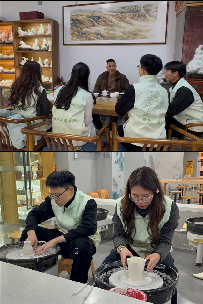 “指尖凝匠心,坯中藏古韵。”实践队拜访国家级非遗传承人徐文守大师,聆听其对陶瓷技艺精髓与创作理念的深度解读,近距离观摩瓷塑精品,体悟“择一事、终一生”的匠人精神。在陶瓷瓷艺城,队员们沉浸式体验拉坯、塑形等核心工序,在一揉一捏间感受千年瓷艺的温度与魅力。结合实践观察,队员们针对制瓷周期长、成本高等问题,创新提出“陶瓷微体验”“素坯彩绘”等建议,为红旗坊设计制作宣传手册,以青年智慧推动非遗技艺亲民化传播,让传统文化在守正创新中焕发蓬勃生机。