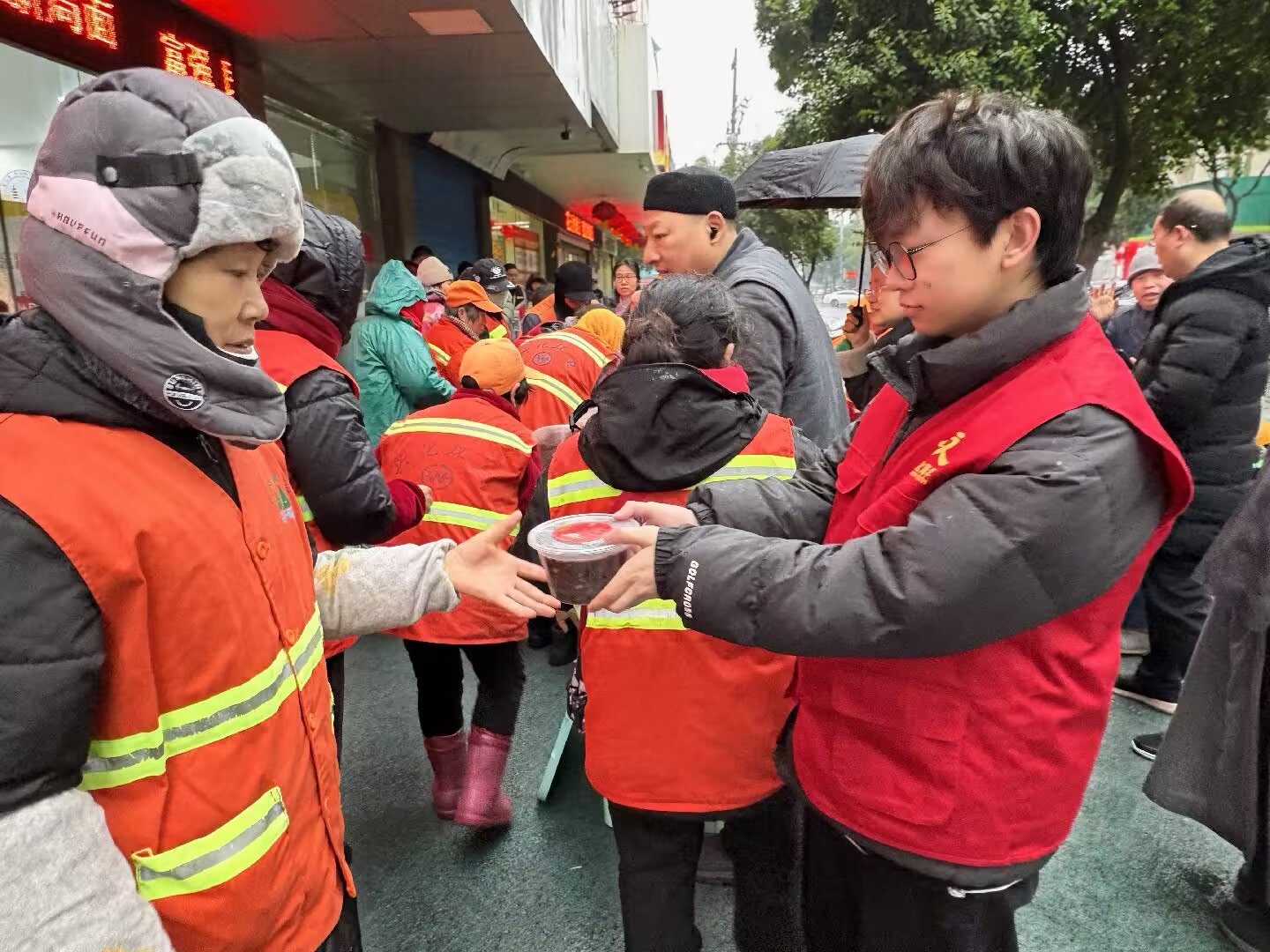 图为队员唐明浩为社区环卫工人分发腊八粥。唐明浩通讯员摄