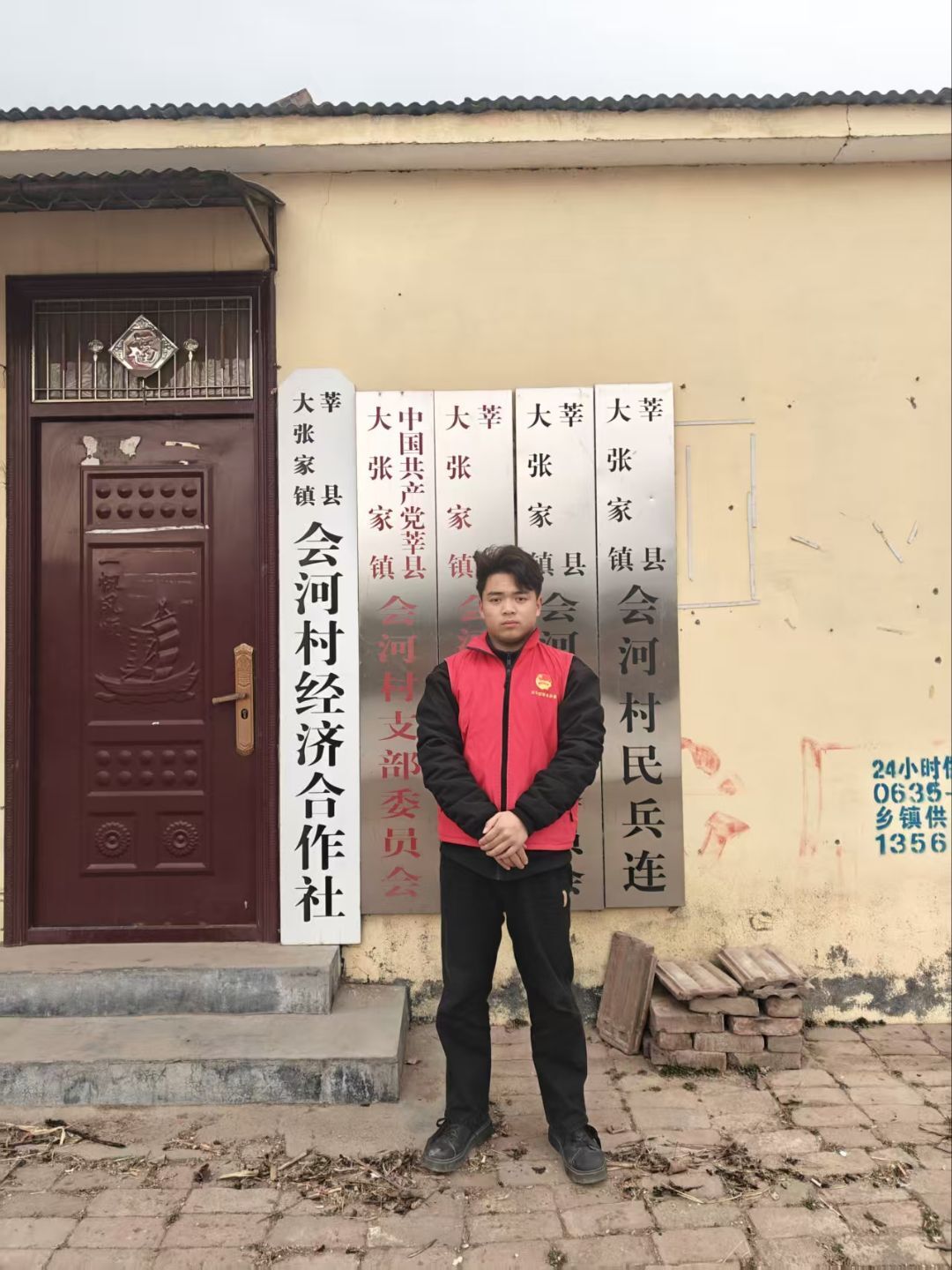 图为队员张兴旺在会河村村委会门前整装待发。张兴旺通讯员摄