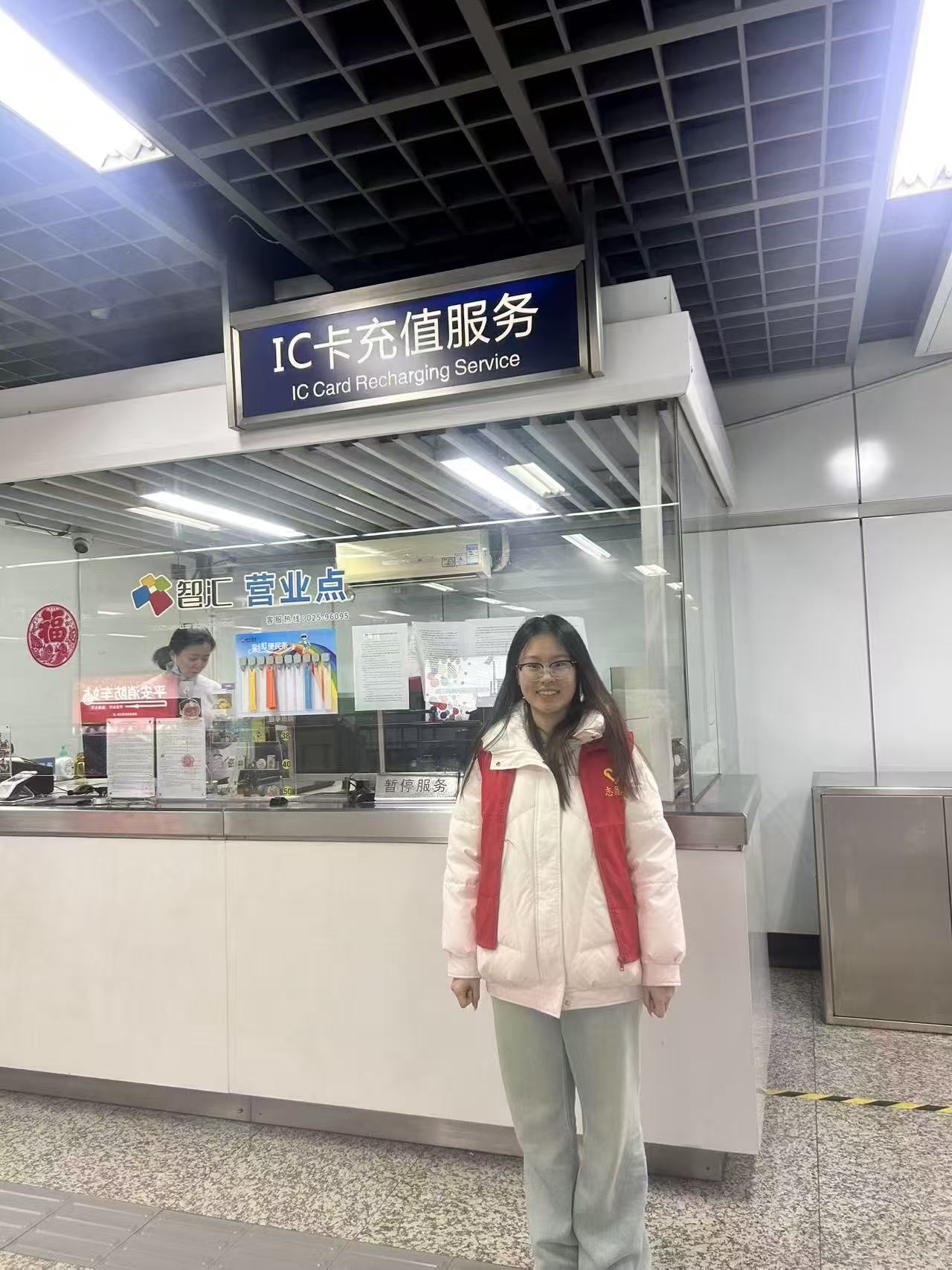 图为实践人员在IC卡充值服务营业点开展志愿服务,为需要办理地铁卡充值业务的乘客提供引导与咨询,协助乘客了解充值流程,减少排队等待时间,提升公共服务温度。陈思媛 供图