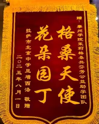 三、情暖高原,锦旗载誉映初心这份跨越山海的善意,收获了最真挚的回响。拉萨市北京中学旦增西洛老师代表学生,为团队送上“格桑天使,花朵园丁”的锦旗,烫金大字是雪域高原最珍贵的肯定,更是我们前行的动力。