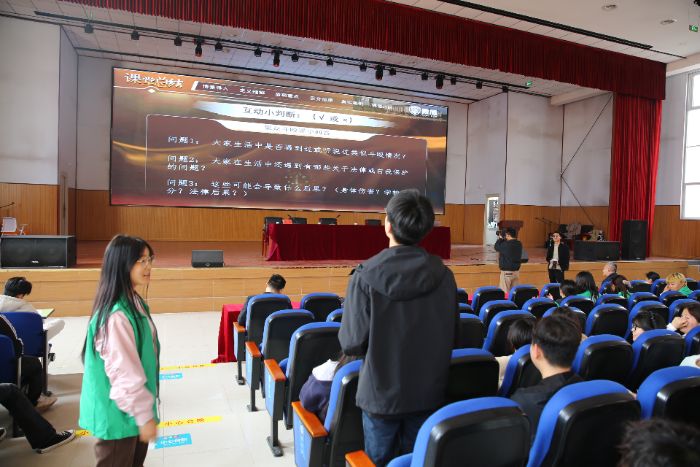 为巩固学习成效,宣讲团设计了“糖果别顺手牵”“击鼓传花法治竞答”等趣味互动环节。在“糖果别顺手牵”游戏中,同学们通过接力传递糖果,直观体会“未经允许不得擅自占有他人财物”的行为准则;“击鼓传花”环节则将现场氛围推向高潮,同学们围绕聚众斗殴罪、盗窃罪相关法律知识踊跃答题,在轻松互动中巩固法律常识,提升尊法、学法、守法、用法的自觉性。