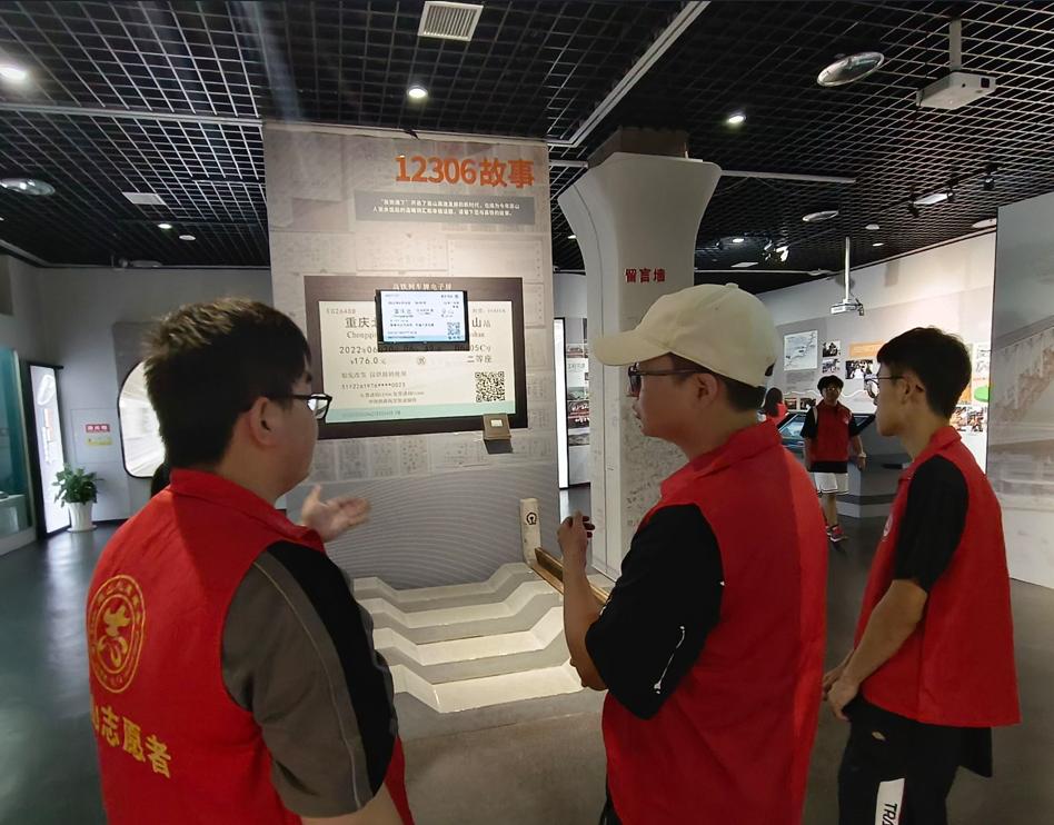 图为博物馆志愿者为实践队员讲述12306故事