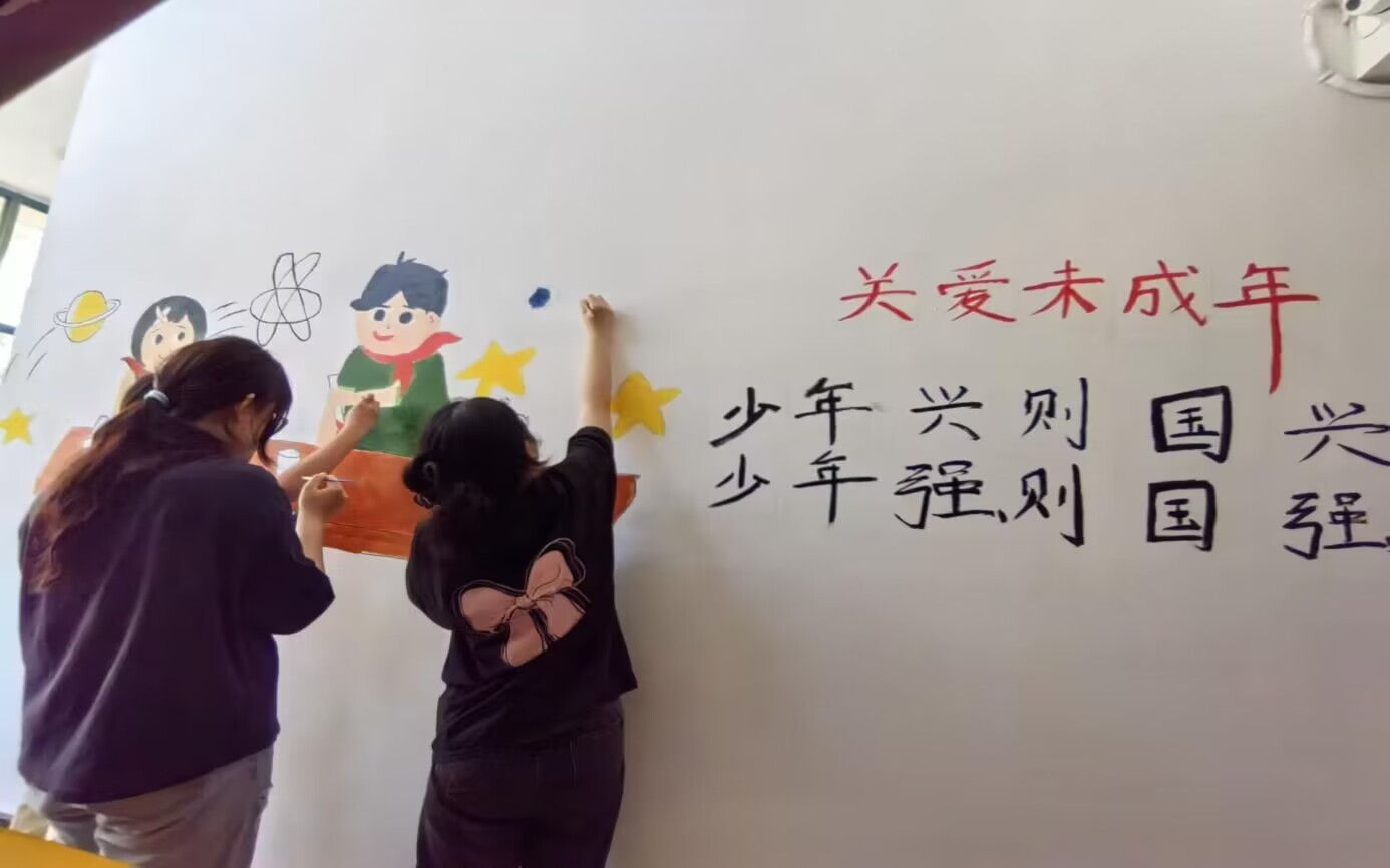 第三幅墙绘以“关爱未成年人”为核心主题,由朱宏超、谢静、杨婧瑜三名队员共同协作精心绘制而成。这是一幅传递关爱未成年人理念的宣传教育画作。在墙绘的左侧,两位孩子正坐在桌边,其中一位孩子正热情地发表着自己的观点。而墙绘的右侧醒目地书写着“关爱未成年人”以及“少年兴则国兴,少年强则国强”的标语。这幅作品深刻强调了青少年在推动国家发展进程中的关键角色,寓意着国家的繁荣与昌盛依赖于青少年的活力与积极进取,国家的强大与振兴依赖于青少年的全面素质与能力提升。