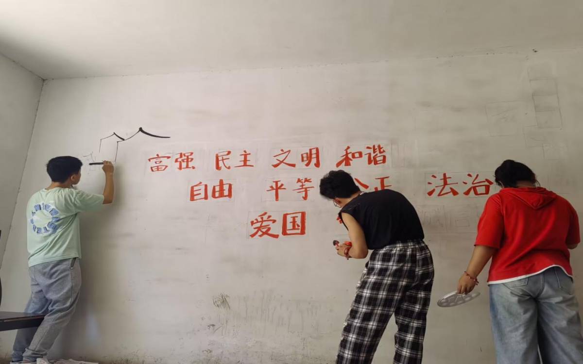 图为社会主义核心价值观墙绘的绘画过程 祁继平 供图